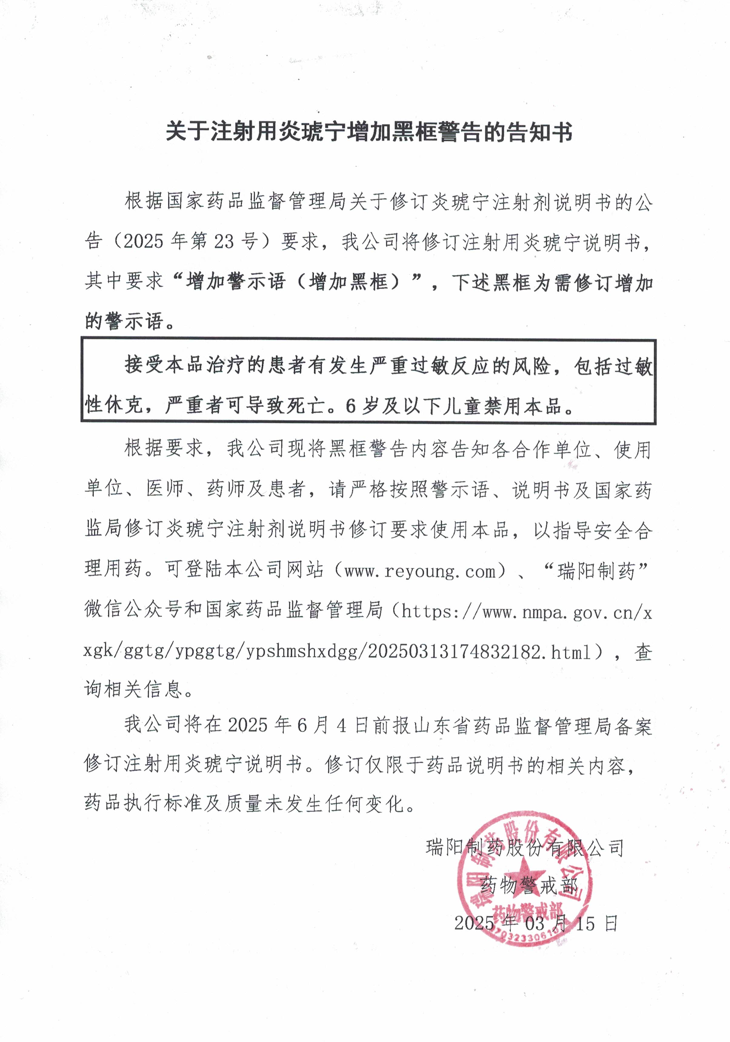 關于注射用炎琥寧增加黑框警告的告知書